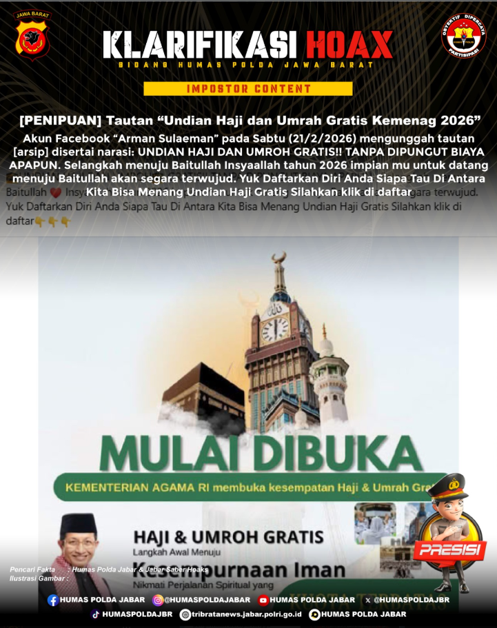 [PENIPUAN] Tautan “Undian Haji dan Umrah Gratis Kemenag 2026” – Tribratanews Polda Jabar No Result View All Result Berita Nasional Internasional Hukum Sosial Budaya Keamanan Kesehatan Olahraga CEK FAKTA No Result View All Result No Result View All Result Berita Nasional Internasional Hukum Sosial Budaya Keamanan Kesehatan Olahraga CEK FAKTA Home Berita [PENIPUAN] Tautan “Undian Haji dan Umrah Gratis Kemenag 2026” Maret 4, 2026 in Berita Reading Time: 1 min read Akun Facebook “Arman Sulaeman” pada Sabtu (21/2/2026) mengunggah tautan [arsip] disertai narasi: UNDIAN HAJI DAN UMROH GRATIS!! TANPA DIPUNGUT BIAYA APAPUN. Selangkah menuju Baitullah Insyaallah tahun 2026 impian mu untuk datang menuju Baitullah akan segara terwujud. Yuk Daftarkan Diri Anda Siapa Tau Di Antara Kita Bisa Menang Undian Haji Gratis Silahkan klik di daftar CEK FAKTA:Tim Pemeriksa Fakta mengakses tautan dalam unggahan. Diketahui, tautan mengarah ke halaman berisi formulir digital yang meminta pengisian data pribadi seperti nama, alamat dan nomor telegram. Tim Pemeriksa Fakta lalu memeriksa profil akun Facebook “Arman Sulaeman”, diketahui akun tersebut baru memiliki 9 pengikut serta membuat 6 kali postingan yang sebagian besar isinya adalah penipuan tentang program haji dan umrah gratis dari Kemenag. Tim Pemeriksa Fakta lalu memasukkan kata kunci “penipuan undian haji dan umrah gratis kemenag” ke mesin pencarian Google. Hasil penelusuran mengarah ke akun Instagram resmi Kementerian Agama (Kemenag) “kemenag_ri”, isinya meluruskan klaim yang beredar. “Kementerian Agama Tidak Menyelenggarakan Program Umrah Gratis,” tulis Kemenag pada Agustus 2025. Ditegaskan, semua informasi resmi mengenai program dan layanan Kemenag hanya dipublikasikan melalui laman kemenag.go.id dan akun media sosial resmi kemenag_ri yang terverifikasi. Baca Juga Gol Chip Rafael Leao Selamatkan AC Milan dari Kekalahan Kontra Como 1907KESIMPULAN:Unggahan berisi tautan “pendaftaran undian haji dan umrah gratis 2026 dari Kemenag 2026” yang mengarah ke laman tak resmi itu merupakan konten tiruan (impostor content). RUJUKAN:https://turnbackhoax.id/articles/32623-penipuan-tautan-undian-haji-dan-umrah-gratis-kemenag-2026 ShareTweetSend Previous Post Presiden Prabowo Tegaskan Pentingnya Kesatuan Sikap dan Kesiapsiagaan Nasional dalam Rangka Hadapi Dinamika Global BeritaTerkait Berita Presiden Prabowo Tegaskan Pentingnya Kesatuan Sikap dan Kesiapsiagaan Nasional dalam Rangka Hadapi Dinamika Global Maret 4, 2026 Berita KONI Jawa Barat Dukung Penetapan Daerah Penyangga untuk PON XX/2028 Maret 4, 2026 Berita Kapolda Jabar Rudi Setiawan Soroti Prestasi Program Sosial, Bangun 168 Rumah Layak untuk Masyarakat Kurang Mampu Maret 4, 2026 Discussion about this post Berita Terbaru Berita [PENIPUAN] Tautan “Undian Haji dan Umrah Gratis Kemenag 2026” Maret 4, 2026 Presiden Prabowo Tegaskan Pentingnya Kesatuan Sikap dan Kesiapsiagaan Nasional dalam Rangka Hadapi Dinamika Global Maret 4, 2026 KONI Jawa Barat Dukung Penetapan Daerah Penyangga untuk PON XX/2028 Maret 4, 2026 Kapolda Jabar Rudi Setiawan Soroti Prestasi Program Sosial, Bangun 168 Rumah Layak untuk Masyarakat Kurang Mampu Maret 4, 2026 Peringatan Pemerintah: Campak Bukan Penyakit Ringan, Risiko Komplikasi Berat dan Kematian Masih Mengintai Maret 4, 2026 Kabid Humas Polda Jabar Siapkan Pengamanan Mudik Lebaran dan Bantuan Sosial Rutilahu Maret 4, 2026 Bandung Indramayu Powered by Evermos Tentang Kami Pedoman Media Siber Kontak Indeks No Result View All Result Berita Nasional Internasional Hukum Sosial Budaya Keamanan Kesehatan Olahraga CEK FAKTA © 2025 Tribratanews Polda Jabar – Hak Cipta Dilindungi Undang-Undang.