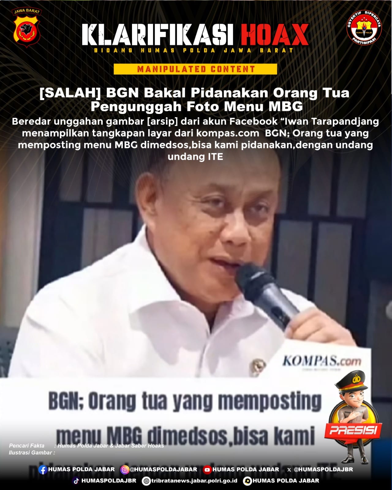 [SALAH] BGN Bakal Pidanakan Orang Tua Pengunggah Foto Menu MBG – Tribratanews Polda Jabar No Result View All Result Berita Nasional Internasional Hukum Sosial Budaya Keamanan Kesehatan Olahraga CEK FAKTA No Result View All Result No Result View All Result Berita Nasional Internasional Hukum Sosial Budaya Keamanan Kesehatan Olahraga CEK FAKTA Home Berita [SALAH] BGN Bakal Pidanakan Orang Tua Pengunggah Foto Menu MBG Maret 5, 2026 in Berita, CEK FAKTA Reading Time: 2 mins read Beredar unggahan gambar [arsip] dari akun Facebook “Iwan Tarapandjang menampilkan tangkapan layar dari kompas.com BGN; Orang tua yang memposting menu MBG dimedsos,bisa kami pidanakan,dengan undang undang ITE CEK FAKTA:Faktanya kebenaran klaim dengan menghubungi Kepala BGN, Dadan Hindayana. Dia menyebut postingan tersebut tidak benar.Penelusuran dilanjutkan dengan memasukkan gambar tersebut ke mesin pencarian gambar Google Lens. Hasilnya ditemukan unggahan artikel dari akun Facebook “Kompas.com” pada Rabu (18/2/2026) yang menampilkan gambar serupa namun dengan narasi “BGN: Insentif Rp 6 Juta Per Hari untuk SPPG Lebih Efisien Dibanding Bangun Sendiri Dalam artikel tersebut sama sekali tidak membahas larangan untuk mengunggah menu MBG di medsos. Artikel itu memuat penjelasan Kepala BGN Dadan Hindayana soal insentif Rp6 juta per hari pada yayasan SPPG atau dapur MBG.Di sisi lain, Wakil Kepala Badan Gizi Nasional (BGN) Nanik Sudaryati Deyang mempersilakan warga masyarakat untuk mengunggah gambar ataupun video menu dapur Makan Bergizi Gratis (MBG) yang dikonsumsi anak-anak mereka ke media sosial. Meski demikian, Nanik menyarankan agar pengunggah gambar maupun video di media sosial itu mencantumkan keterangan yang lengkap tentang menu MBG yang diunggahnya itu. Baca Juga  Bukti Kamera Trap Ungkap Perburuan Liar Macan Tutul Jawa, Kasus Dilimpahkan ke Polres Purwakarta KESIMPULAN: unggahan tersebut merupakan manipulasi dari artikel kompas.com dengan judul asli “BGN: Insentif Rp 6 Juta Per Hari untuk SPPG Lebih Efisien Dibanding Bangun Sendiri”. Unggahan berisi klaim “BGN bakal pidanakan orang tua pengunggah foto menu MBG” merupakan konten yang dimanipulasi (manipulated content). (Ditulis oleh Pekik Jalu Utomo) Link Referensi : https://www.liputan6.com/cek-fakta/read/6289009/cek-fakta-tidak-benar-bgn-akan-pidanakan-orangtua-yang-unggah-foto-menu-mbg-di-medsoshttps://nasional.kompas.com/read/2026/02/18/10344611/bgn-insentif-rp-6-juta-per-hari-untuk-sppg-lebih-efisien-dibanding-bangun ShareTweetSend Previous Post Wamenham Mugiyanto Imbau WNI di Timur Tengah Tetap Tenang Next Post Langkah Mantap Sang Pemuncak: Arsenal Amankan Poin Penuh di Markas Brighton BeritaTerkait Berita Keajaiban Kecil dari Dapur: Mengungkap Manfaat Luar Biasa Bawang Putih bagi Kesehatan Tubuh Maret 5, 2026 Berita Langkah Mantap Sang Pemuncak: Arsenal Amankan Poin Penuh di Markas Brighton Maret 5, 2026 Berita Wamenham Mugiyanto Imbau WNI di Timur Tengah Tetap Tenang Maret 5, 2026 Discussion about this post Berita Terbaru Berita Keajaiban Kecil dari Dapur: Mengungkap Manfaat Luar Biasa Bawang Putih bagi Kesehatan Tubuh Maret 5, 2026 Langkah Mantap Sang Pemuncak: Arsenal Amankan Poin Penuh di Markas Brighton Maret 5, 2026 [SALAH] BGN Bakal Pidanakan Orang Tua Pengunggah Foto Menu MBG Maret 5, 2026 Wamenham Mugiyanto Imbau WNI di Timur Tengah Tetap Tenang Maret 5, 2026 [PENIPUAN] Tautan “Undian Haji dan Umrah Gratis Kemenag 2026” Maret 4, 2026 Presiden Prabowo Tegaskan Pentingnya Kesatuan Sikap dan Kesiapsiagaan Nasional dalam Rangka Hadapi Dinamika Global Maret 4, 2026 Bandung         Indramayu Powered by Evermos Tentang Kami Pedoman Media Siber Kontak Indeks No Result View All Result Berita Nasional Internasional Hukum Sosial Budaya Keamanan Kesehatan Olahraga CEK FAKTA © 2025 Tribratanews Polda Jabar – Hak Cipta Dilindungi Undang-Undang.