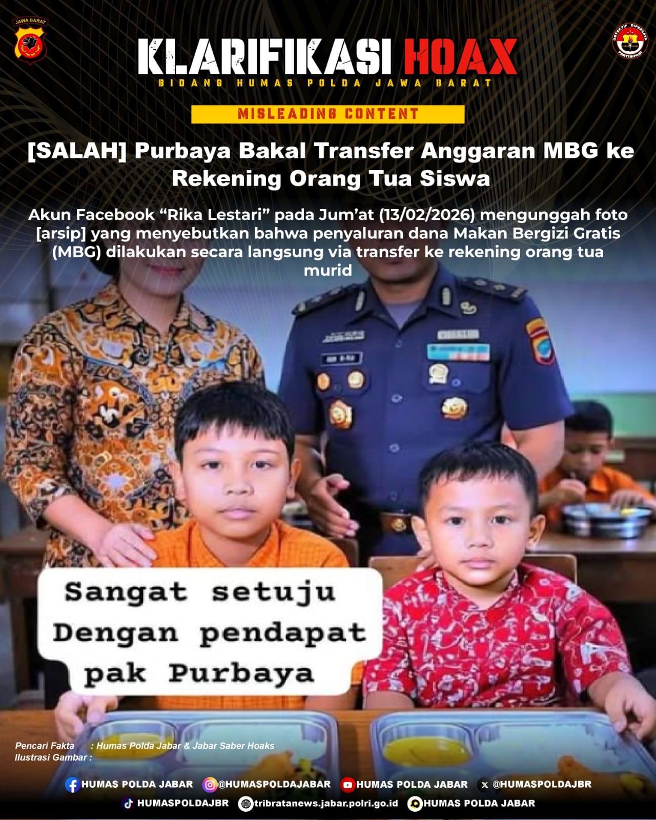 [SALAH] Purbaya Bakal Transfer Anggaran MBG ke Rekening Orang Tua Siswa – Tribratanews Polda Jabar No Result View All Result Berita Nasional Internasional Hukum Sosial Budaya Keamanan Kesehatan Olahraga CEK FAKTA No Result View All Result No Result View All Result Berita Nasional Internasional Hukum Sosial Budaya Keamanan Kesehatan Olahraga CEK FAKTA Home Berita [SALAH] Purbaya Bakal Transfer Anggaran MBG ke Rekening Orang Tua Siswa Februari 23, 2026 in Berita, CEK FAKTA Reading Time: 2 mins read Akun Facebook “Rika Lestari” pada Jum’at (13/02/2026) mengunggah foto [arsip] yang menyebutkan bahwa penyaluran dana Makan Bergizi Gratis (MBG) dilakukan secara langsung via transfer ke rekening orang tua murid PenjelasanTim Pemeriksa Fakta menelusuri klaim yang menyebut Purbaya akan mentransfer anggaran MBG langsung ke rekening orang tua siswa dengan melakukan pencarian menggunakan kata kunci terkait. Hasil penelusuran menunjukkan bahwa informasi tersebut tidak benar dan merupakan hoaks. Berdasarkan pemberitaan Antara yang memuat pernyataan resmi Kementerian Keuangan, Kepala Biro Komunikasi dan Layanan Informasi Kemenkeu, Deni Surjantoro, menegaskan bahwa kabar mengenai penggantian Program MBG menjadi bantuan uang tunai tidak pernah disampaikan secara resmi. Masyarakat diimbau agar lebih bijak dalam menyikapi informasi di media sosial dan waspada terhadap penipuan yang mengatasnamakan pejabat kementerian. Baca Juga  Polrestabes Bandung Berhasil Gagalkan Peredaran KokainKesimpulanTidak ada usulan dari Menteri Keuangan Purbaya Yudhi Sadewa untuk mengganti Program MBG menjadi bantuan uang tunai. Dengan demikian, informasi dengan klaim “Purbaya bakal transfer anggaran MBG ke rekening orang tua siswa” merupakan konten yang menyesatkan (misleading content). Referensihttps://www.antaranews.com/berita/5300179/hoaks-purbaya-minta-presiden-prabowo-ganti-mbg-dengan-uang-tunaihttps://turnbackhoax.id/articles/30453https://web.facebook.com/rika.lestary.511290/posts/pfbid034nuAtXkp4kzuSHpWxu9YRV7puFdY5ffXF1qEeBEgyCQM2spmSNeWbn4pE6pGdXjul?_rdc=1&_rdr#https://archive.ph/cx1FS ShareTweetSend Previous Post Hadirkan Program RAWATIB, Polres Subang Jamin Keamanan dan Kenyamanan Ibadah Selama Ramadan BeritaTerkait Berita Hadirkan Program RAWATIB, Polres Subang Jamin Keamanan dan Kenyamanan Ibadah Selama Ramadan Februari 23, 2026 Berita Bantu Pemulihan Warga, Kapolres Sumedang Pimpin Langsung Korve Bersama Bersihkan Material Longsor di Citengah Februari 23, 2026 Berita Gerak Cepat! Hanya 6 Jam, Polres Sumedang Ungkap Kasus Pembunuhan dan Curas di Girimukti Februari 23, 2026 Discussion about this post Berita Terbaru Berita [SALAH] Purbaya Bakal Transfer Anggaran MBG ke Rekening Orang Tua Siswa Februari 23, 2026 Hadirkan Program RAWATIB, Polres Subang Jamin Keamanan dan Kenyamanan Ibadah Selama Ramadan Februari 23, 2026 Bantu Pemulihan Warga, Kapolres Sumedang Pimpin Langsung Korve Bersama Bersihkan Material Longsor di Citengah Februari 23, 2026 Gerak Cepat! Hanya 6 Jam, Polres Sumedang Ungkap Kasus Pembunuhan dan Curas di Girimukti Februari 23, 2026 Gelar Tes Urine Dadakan, Kapolresta Cirebon: Tak Ada Toleransi Bagi Anggota yang Terlibat Narkoba Februari 23, 2026 Kasus KDRT ART di Gunung Putri: Oknum ASN BPK Resmi Ditahan Polres Bogor Februari 23, 2026 Bandung         Indramayu Powered by Evermos Tentang Kami Pedoman Media Siber Kontak Indeks No Result View All Result Berita Nasional Internasional Hukum Sosial Budaya Keamanan Kesehatan Olahraga CEK FAKTA © 2025 Tribratanews Polda Jabar – Hak Cipta Dilindungi Undang-Undang.
